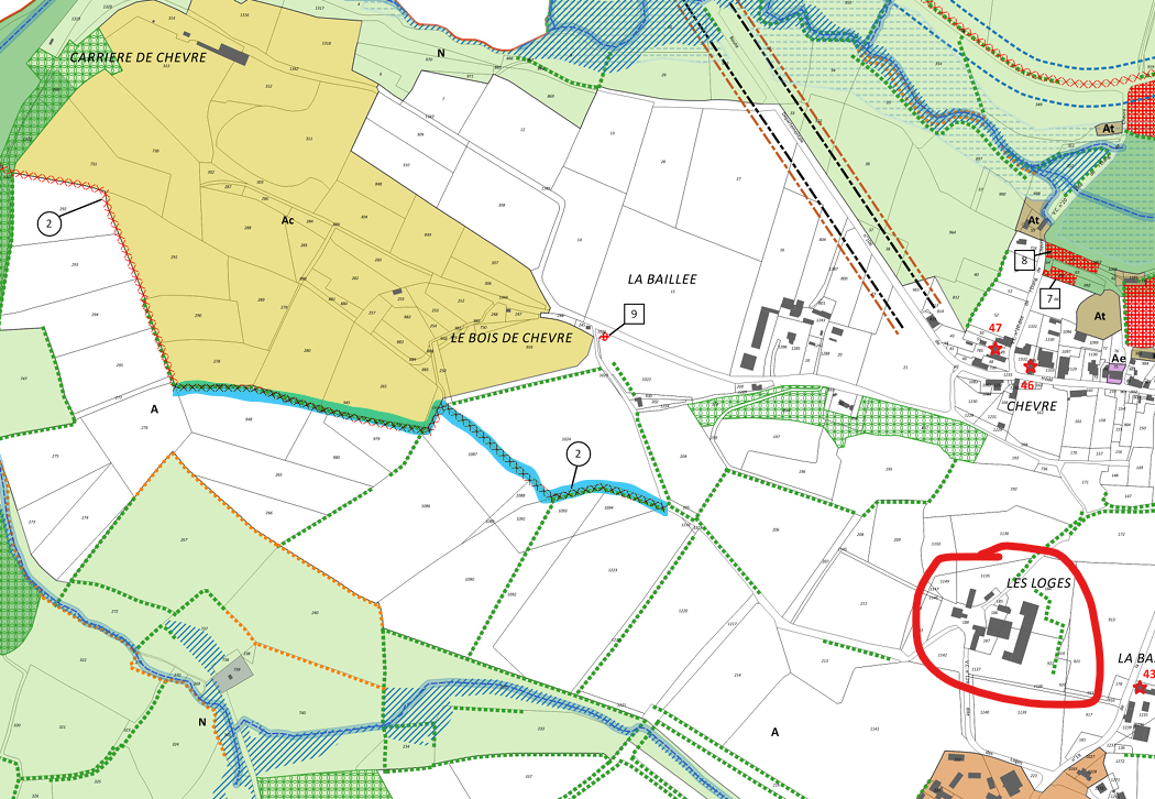 Sur cette même commune les secteurs situés au nord (La Barbotais et La Chesnaie aux Butteaux) sont aussi classés en zone Agricole, mais Ah permettant donc la constructibilité de ses terrains situés en bord de route.