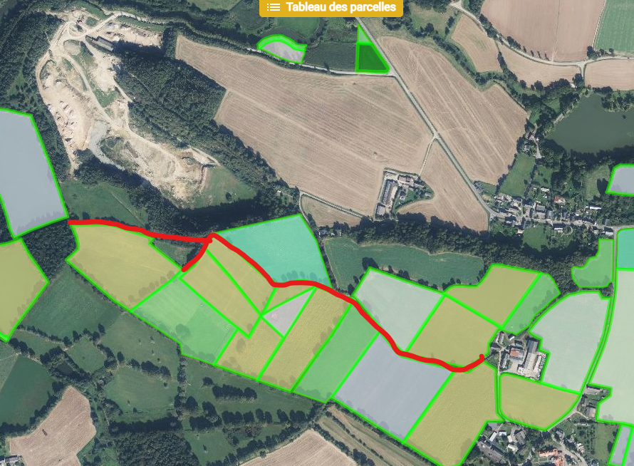 - La première comporte en rouge le tracé complet de mon chemin d'exploitation. Tous les champs qui le bordent sans exception sont en ma possession et constituent ce qu'on appelle le parcellaire accessible à mes animaux sans transport.